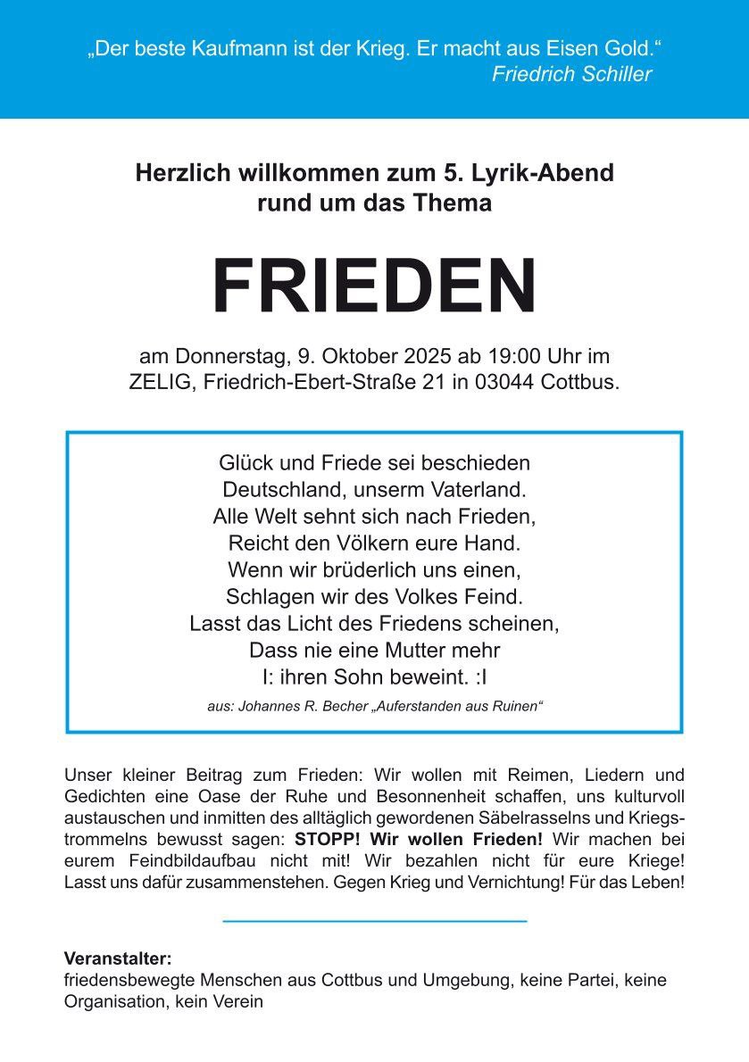 Um diesen Trend aufzuhalten, bedarf es vieler Menschen mit unterschiedlichsten friedvollen Ideen, die dagegen halten. Eine davon ist der Lyrikabend "Friedenslogik" im ZELIG am 9. Oktober ab 19 Uhr. Wir wollen eine Oase schaffen, in der sich Menschen kulturvoll und wertschätzend über Frieden und Alternativen zur derzeitigen Kriegsbesoffenheit austauschen können.